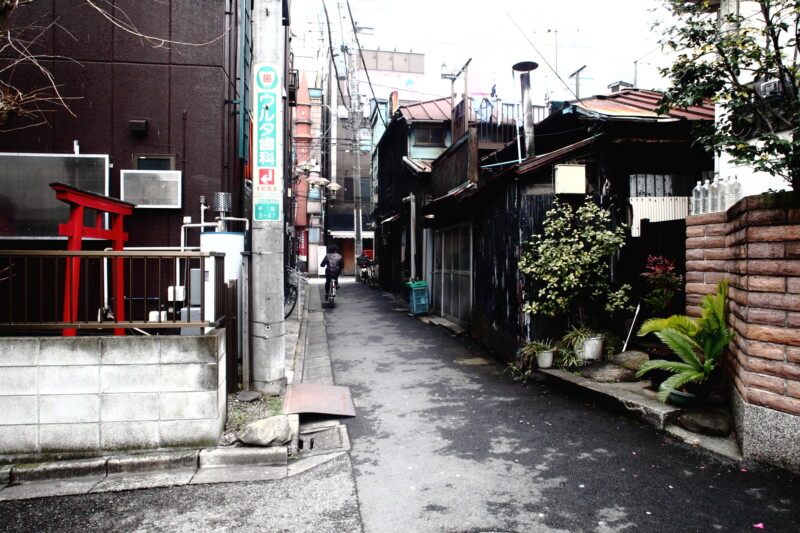 ph9 旧日光街道西側の路地。古びた木造建築の家屋がならぶ。左手前に稲荷社。右手前の塀の上にはネコ除けのペットボトル。千住3-47(左)、43(右)。2010.2.17