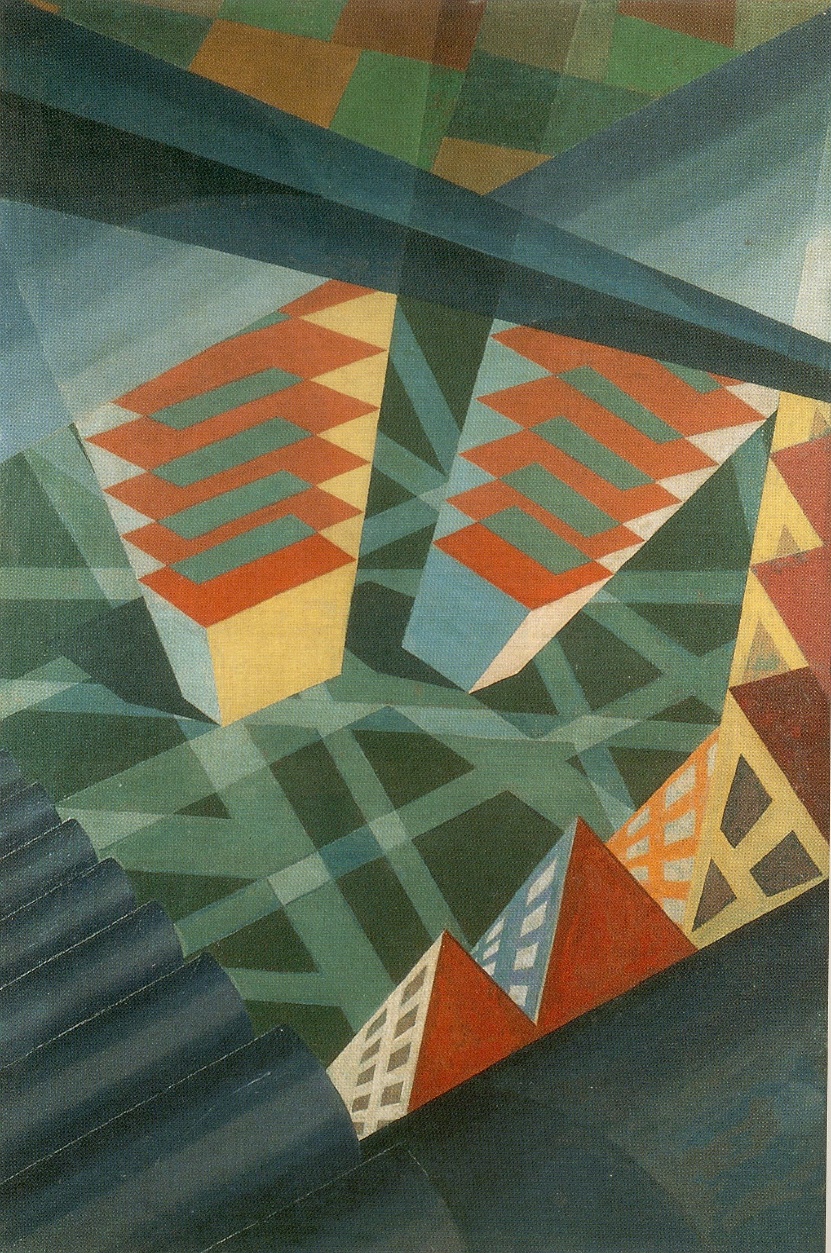 図1:アザーリ《飛行のパースペクティヴProspettiva di volo》、1926年(キャンバスに油彩、120×85cm、個人蔵)