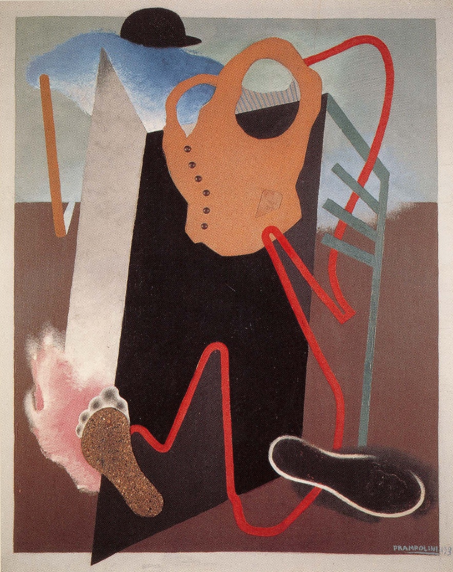 図3:プランポリーニ《日常的な自動人形(機械人間)L’automata quotidiano》、1930年(板に油彩とコラージュ、100×80cm、国立ローマ近代美術館)