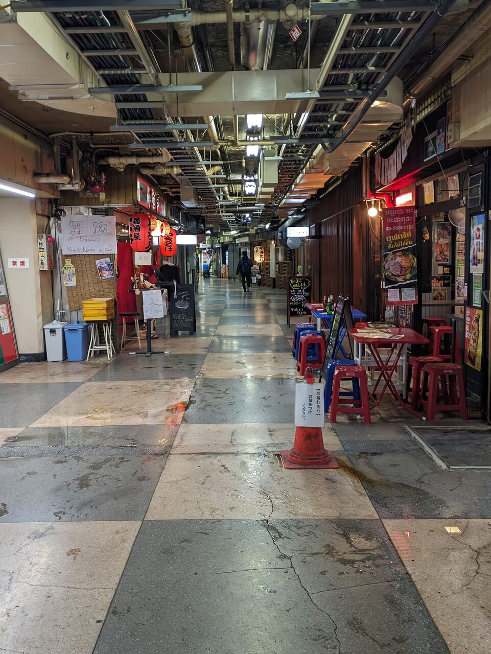 銀座線浅草駅 浅草地下商店街 【水漏れあり】お気をつけくださいとコーンポストに 年季のいききった床の染みに見えるのは天井由来の水 背中を丸くしてがに股で歩く快楽(けらくと読む)がいつ来たってあるここ