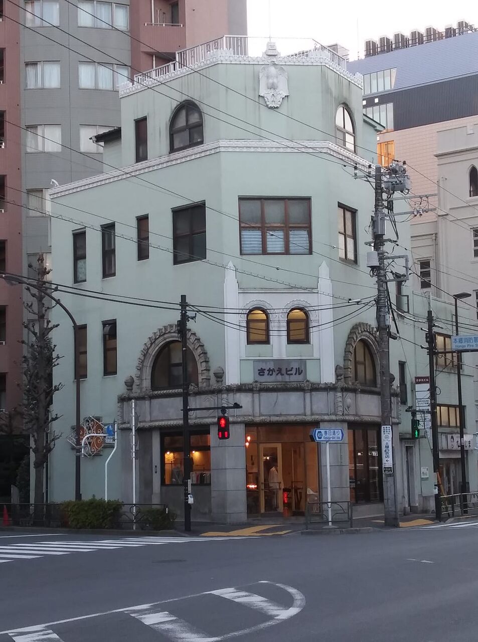 本富士警察署斜め前の「さかえビル」(1934年竣工の登録有形文化財) 立哨の警官の視線を背に感じながら立ち止まること暫し