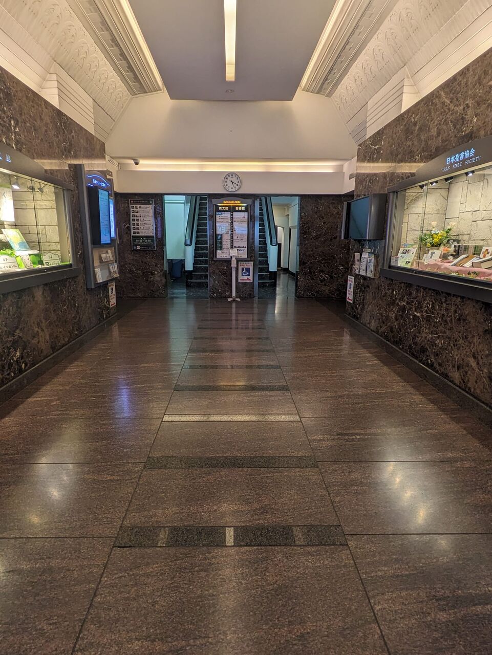 銀座四丁目 教文館と聖書館の共同ビルの玄関ホール 大理石の黒さと複雑な装飾の天井の白さ 入った瞬間の静謐 案内パネル壁の奥は実は二にして一に見える階段 一にして二の建物だから レーモンドの設計