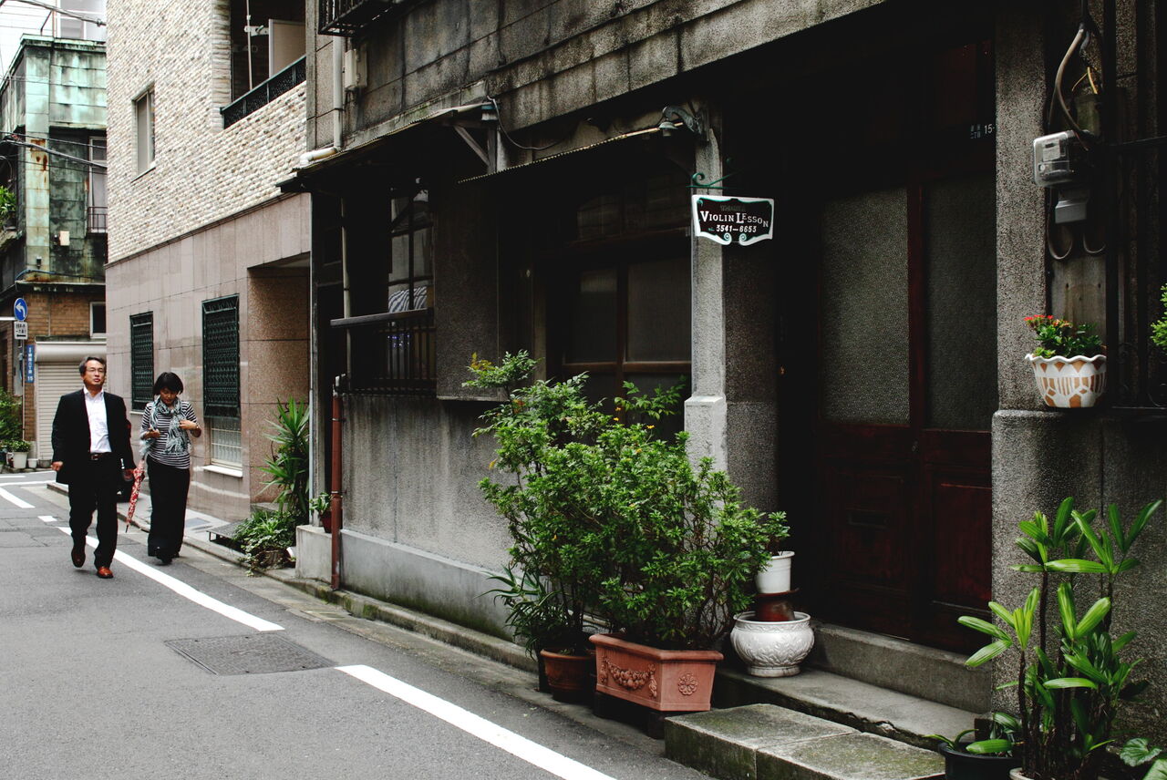 ph22 首都高都心環状線の三吉橋近くの路地。玄関に「violin lesson」の看板を吊るす。奥はph19の橋本印刷。銀座2-15。2009.10.5