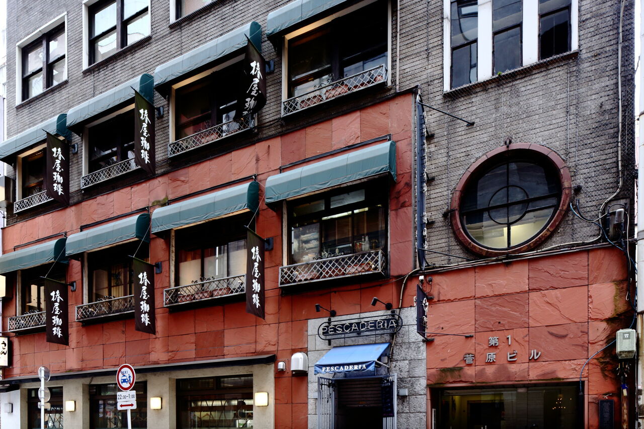 ph9 花椿通りと銀座すずらん通りとの交差点。第一菅原ビル。1934年の竣工。菅原電気は日本における電気洗濯機やミキサーの開発に先駆的な役割を果たしたという。現在は2階と3階には椿屋珈琲本店が入っている。銀座7-7-11。2024.10.24