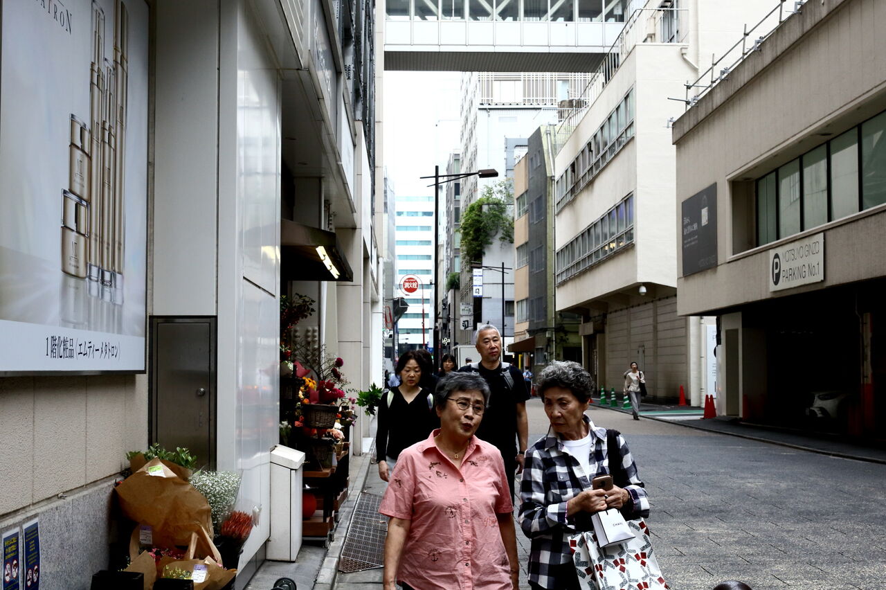 ph16 あづま通り。渡り廊下の左右は松屋デパート。永井荷風の小説『つゆのあとさき』の舞台。この付近に主人公の勤めるカフェ・ドンファンがあったことになっている。銀座3-6-1。2024.10.24