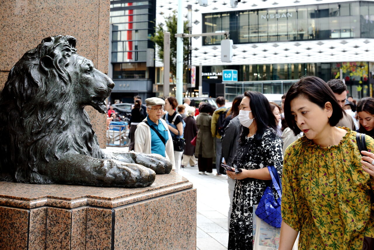 ph11 中央通り、銀座4丁目交差点。銀座三越畫店正面入口のライオン像。銀座三越の開業は1930年。このライオン像は1972年に三越創業300年の記念事業として鋳造された。銀座4-6-16。2024.10.24