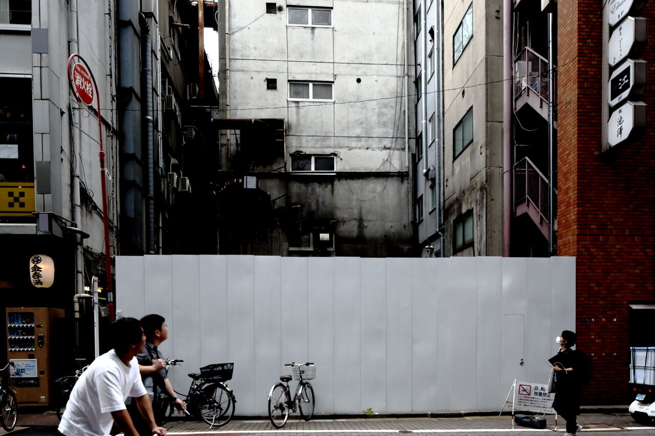 ph26 金春通り。ビルが取り壊されたあとの空き地。右隣の提灯は銭湯金春湯。1863年の開業。屋号は金春流能役者の屋敷が近くにあったことに由来する。1957年に建て替えて、ビル内に銭湯を構えるようになった。そのころはこのあたりで一番高い建物だったという。銀座8-7-5。2024.10.24