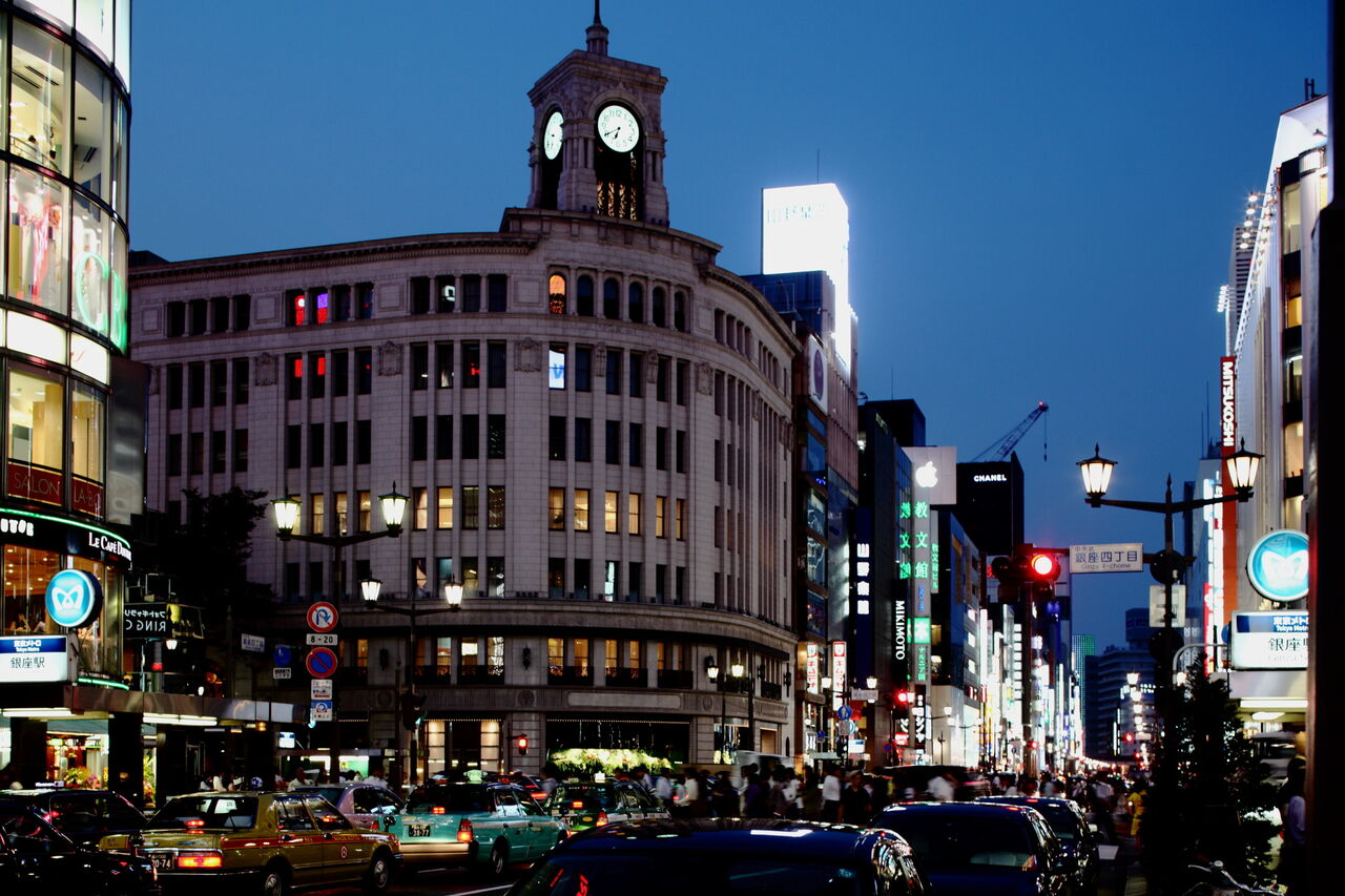 ph2 銀座通り、銀座4丁目交差点。和光ビル。現在の時計塔は2代目で、竣工は1932年。関東大震災復興の象徴として建設され、銀座のランドマークとなった。左端は2023年に取り壊された三愛ビル。銀座4-5-11。2009.8.19
