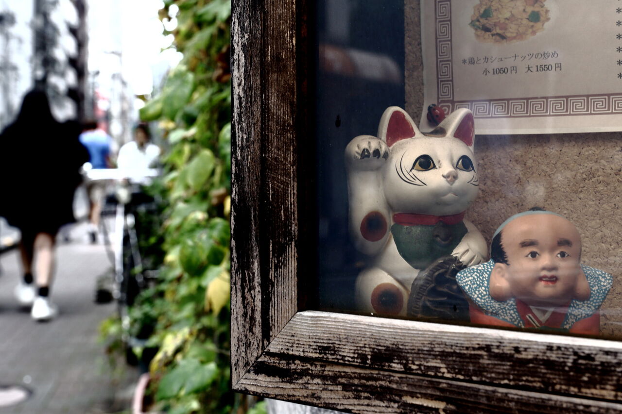 ph13 銀座マロニエ通り。中華そば萬福の招き猫と福助。大正時代に屋台からはじめ、1929年に現在地に店を構えたという。銀座2-13-13。2024.10.24