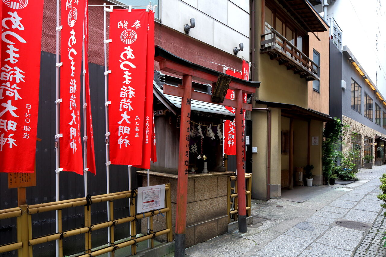 ph14 あづま通り。あづま稲荷大明神。戦後のある時期、あづま通りと三原小路に火災が続いた。それをきっかけに、町内一同で相談し、京都伏見稲荷を勧請したとのこと。銀座5-9-19。2024.10.24