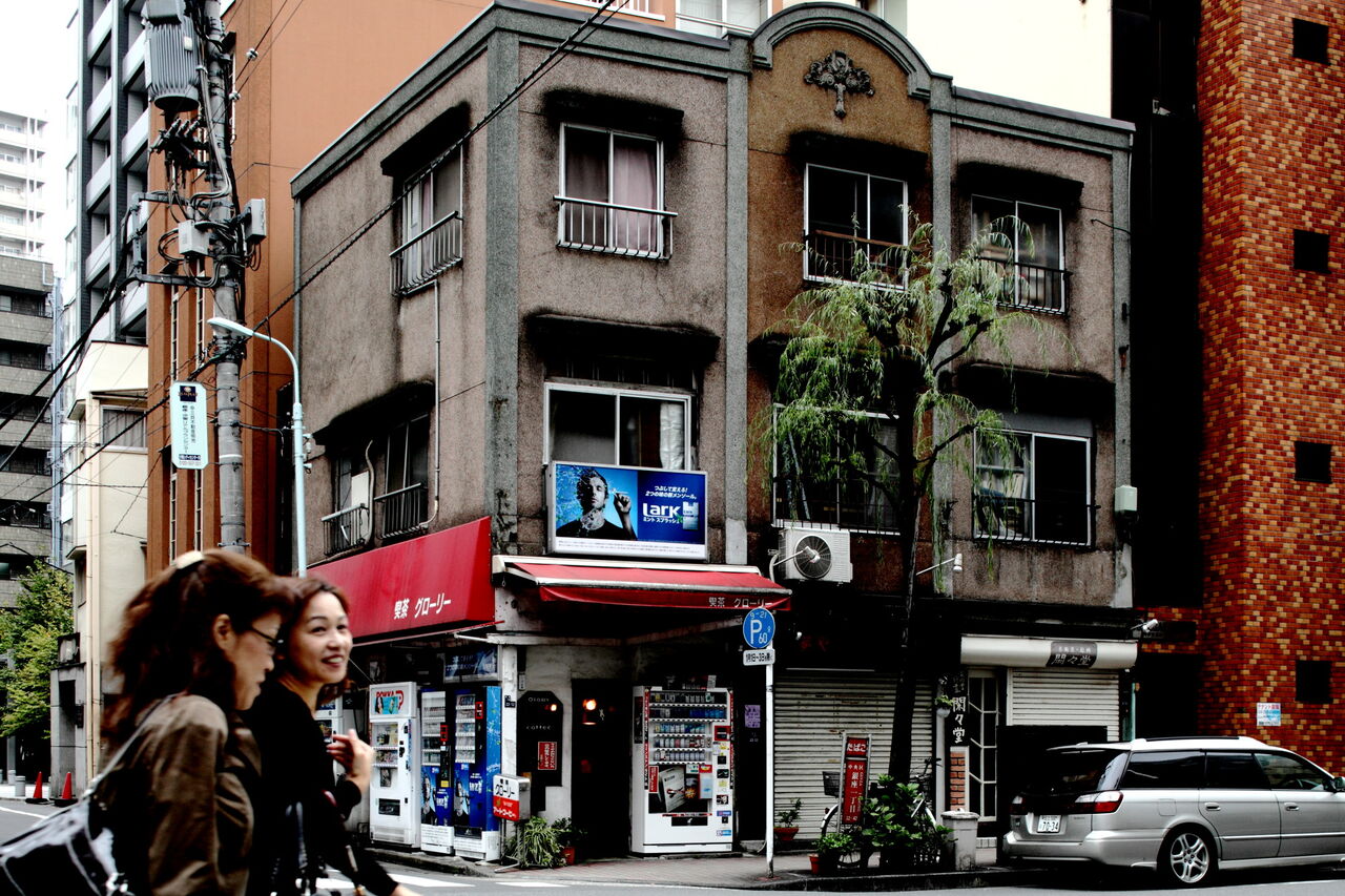 ph20 看板建築のビル。1階は左から喫茶グローリー・夢や・閑々堂の店舗。2階と3階は集合住宅と思われる。銀座1-22。2009.10.5