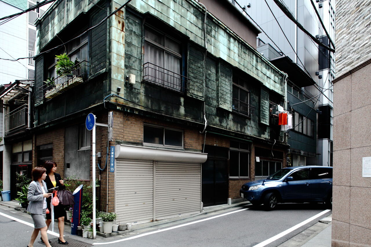 ph21 首都高都心環状線三吉橋近くの路地。橋本印刷。銅板葺きの2階建て建物。工場と住居になっている。銀座2-15。2009.10.5