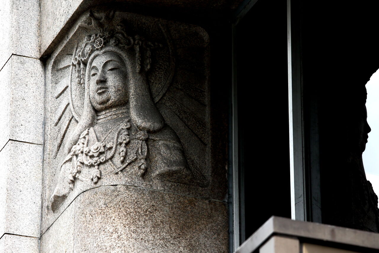 ph12 外堀通り、銀座西6丁目交差点。電通銀座ビル玄関左上の吉祥天像。吉祥天は福徳の女神とされる。玄関右上には広目天像。銀座7-4-17。2016.1.27。