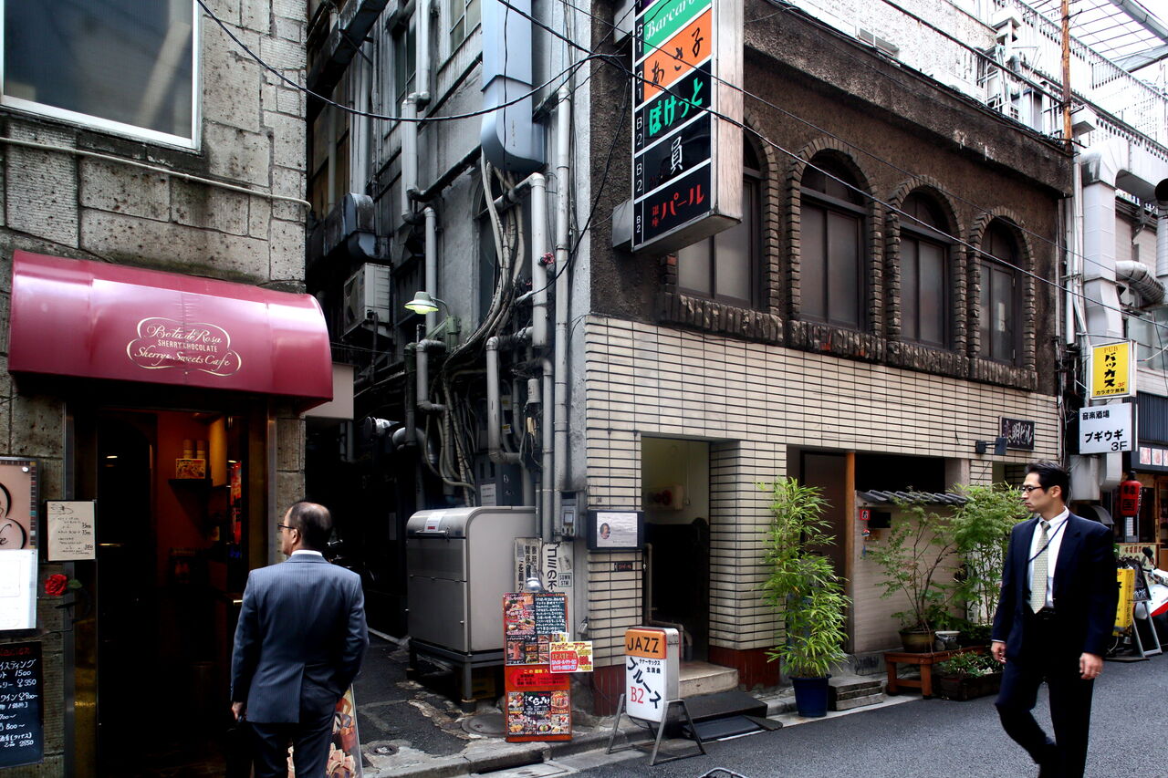 荷風はこの年の5月に小説『つゆのあとさき』を脱稿している(註14)。主人公の君江は銀座にあるカフェの女給である。彼女の勤めるカフェ・ドンファンは「松屋呉服店から二、三軒京橋の方へ寄ったところ」にあった。周りを見渡すと、同じようなカフェが立ちならび、どこが自分の勤める店か紛らわしい。そのため、「君江はざっと一年ばかり通う身でありながら、今だに手前隣の眼鏡屋と金物屋とを目標にして、その間の路地を入る」ことにしていた。「路地を入る」とあるのは、女給たちの出入口が表側の銀座通りではなく、眼鏡屋と金物屋の間の路地または裏通りにあったことを意味する。