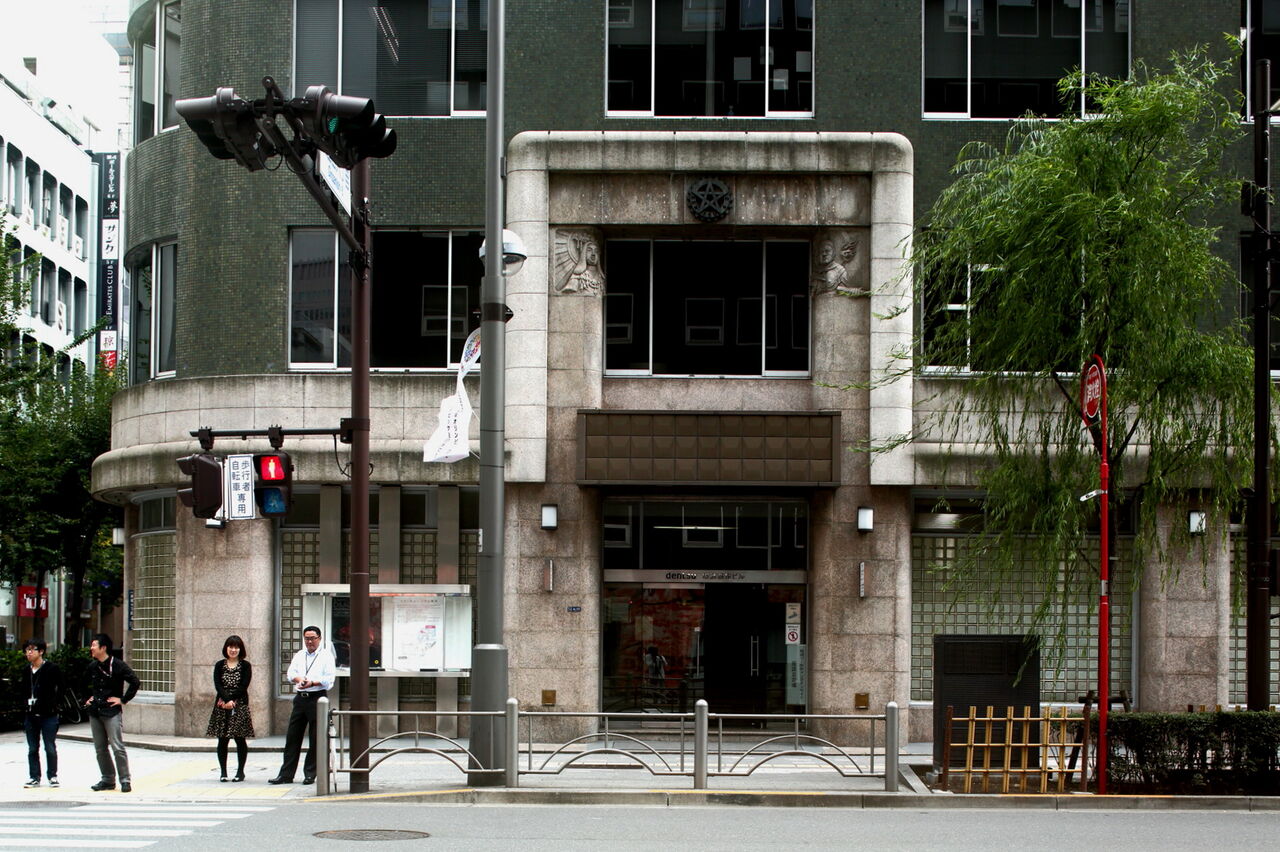 ph6 外堀通り、銀座西6丁目交差点。電通銀座ビル。1933年の竣工。1階のガラスブロックや2階より上のシカゴ窓などが特徴の昭和初期のモダニズム建築。1967年に築地新社屋へ移転するまで、本社ビルとして機能した。銀座7-4-17。2012.10.31