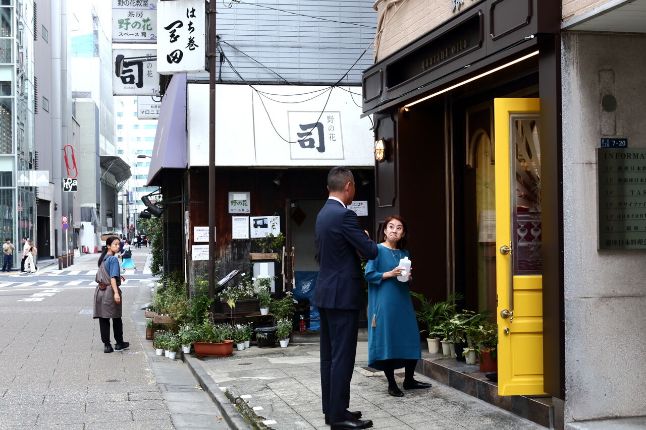 ph17 あづま通り。松屋デパート(京橋寄り)の向かい。野の花 司。野花と茶花の専門店。全国の山野に自生する枝ものや花が揃えられている。銀座3-7-21。2024.10.24