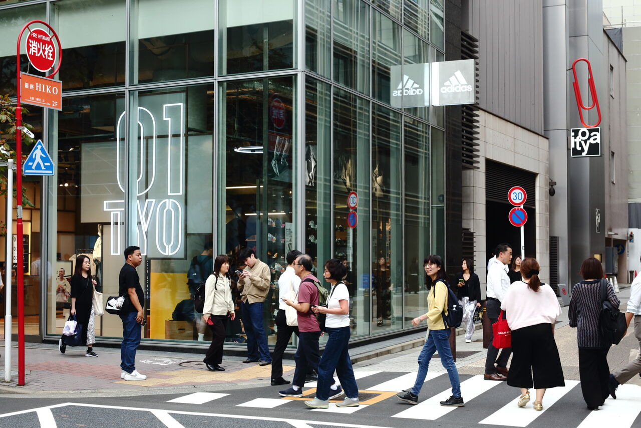 ph18 あづま通りと銀座マロニエ通りの交差点。正面はアディダス銀座店。奥に伊東屋のクリップが見える。大震災のあと、今和次郎たちのバラック装飾社が装飾を手がけたカフェ・キリンはこの付近にあった。銀座2-7。2024.10.24