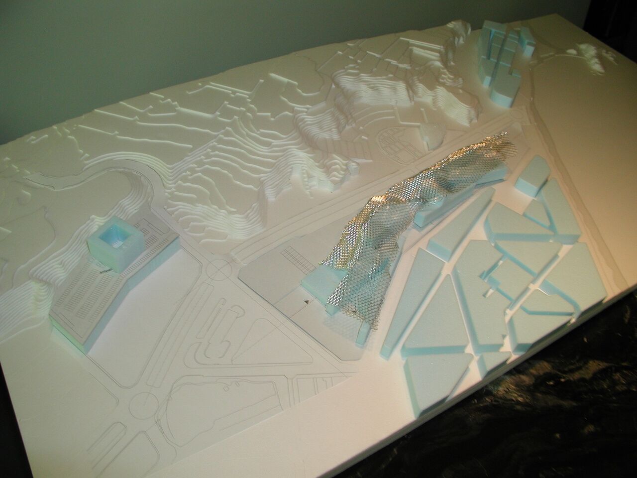 ここに連続したごく軽い屋根を架けるということで、これには佐々木睦郎さんが加わっていた。最初の案は薄い鉄板をふわりと掛けたような形だったが、この後、ガウディがコロニア・グエル教会で使った、紐と、鉛の袋を使って10年という歳月をかけて作った、あの逆吊り模型のような構造に展開していって、佐々木さんによるプログラム開発にまで発展していった。これが佐々木さんによって後にFLUX STRUCTUREと呼ばれるようになるものだ。磯崎さんはガウディが10年かけて逆吊り模型を使って教会堂を設計したのに対し、これをコンピューターの解析能力を使って即座に設計してしまおうということだ。