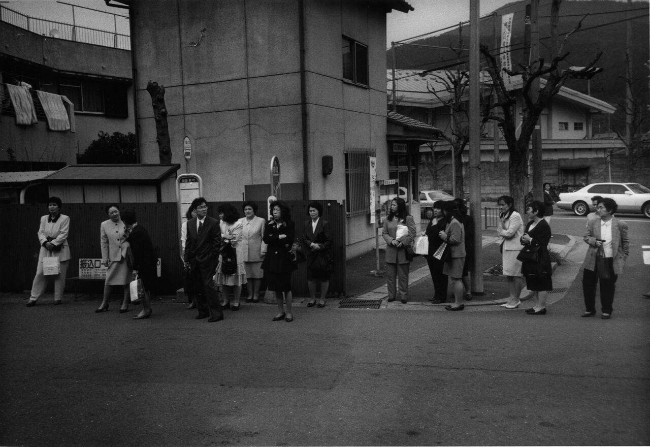 似たような年格好の女性(たぶん4,50 代)ばかりが横に連なり、バスの到着を待って立っている。女性ばかりと書いたが、男性がひとりいる。パリッとしたスーツを着てネクタイを締め、片手に鞄を提げ、もう一方の手はポケットに入れて立っている。