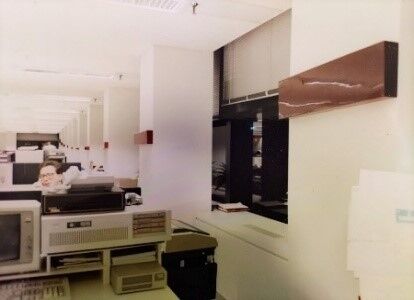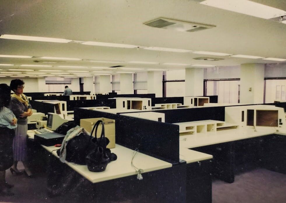 フロアーの下はコンピューターを繋ぐ配線の束が走るスペースで40cmほど底上げしてあるので、天井高は240cmわずかと低く、オフィスの広さに比してやや窮屈な感じの空間であった。間口40mが幅240cmの窓12と幅64cmの13柱で区切られている。職員はここで一日コンピューター画面とむきあうのである。施主の依頼はこの13本柱へのアートワークであった。