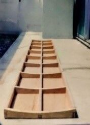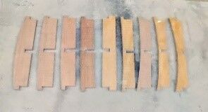 展示予定の主作品が240×30cm×2ピースで上下カーブ凹凸反転で1組。これが2組で4ピース上下波打つ湾曲面を支える桟をつくり組み上げる。前述の要領で長い240cm辺は1cmメモリ、30cm辺は0.5cmメモリを線引き。定規で13目ずつ落としずらして疑似カーブを引く。ジグソーでカットして凸面カンナで反り曲線を仕上げる。この反りと膨らみの格子上に初層ベニヤを釘打ちして曲面ができる。