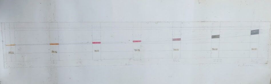 【この図は横に寝ているが縦の配置図である。ディーリング・オフィス窓側の13本柱に左右両サイド黒(闇)から、7本目の中心柱、真紅(太陽)へのグラデーションと作品カーブの推移が重なり収まっている。13作品の上下左右の厚みは、この図のカーブによって制作した。】