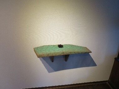 いきなり湾曲面パネルの木工から始まった。成田克彦を通して形のトポロジカルイリュージョンに触れ得たといえよう。そのパネル中央部から切り込みが入れられ、右反り凹面カーブ、左むくみ凸面カーブに分かつ。そしてその結果、パネル下辺で3~4cmに上下ジャンプし、左右に落差を生じる。