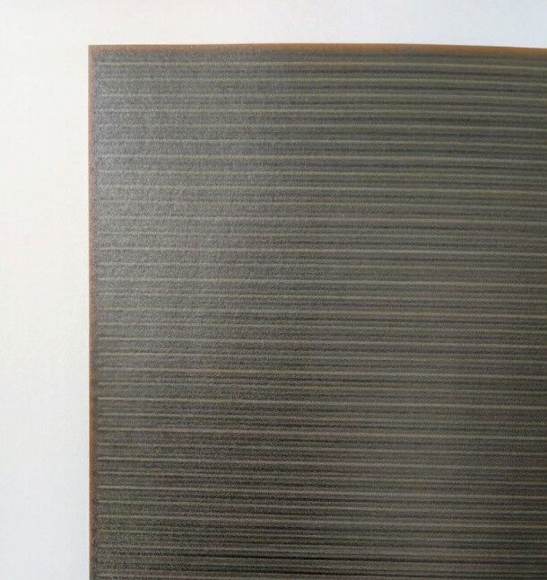 ボールに鉄粒粉を入れ水性アクリルメディウムで攪拌しベニヤ面に直か塗りした。一定の厚みに至るまで、平筆で何度も何度も塗り続ける、いわば単純反復が延々と続いた。