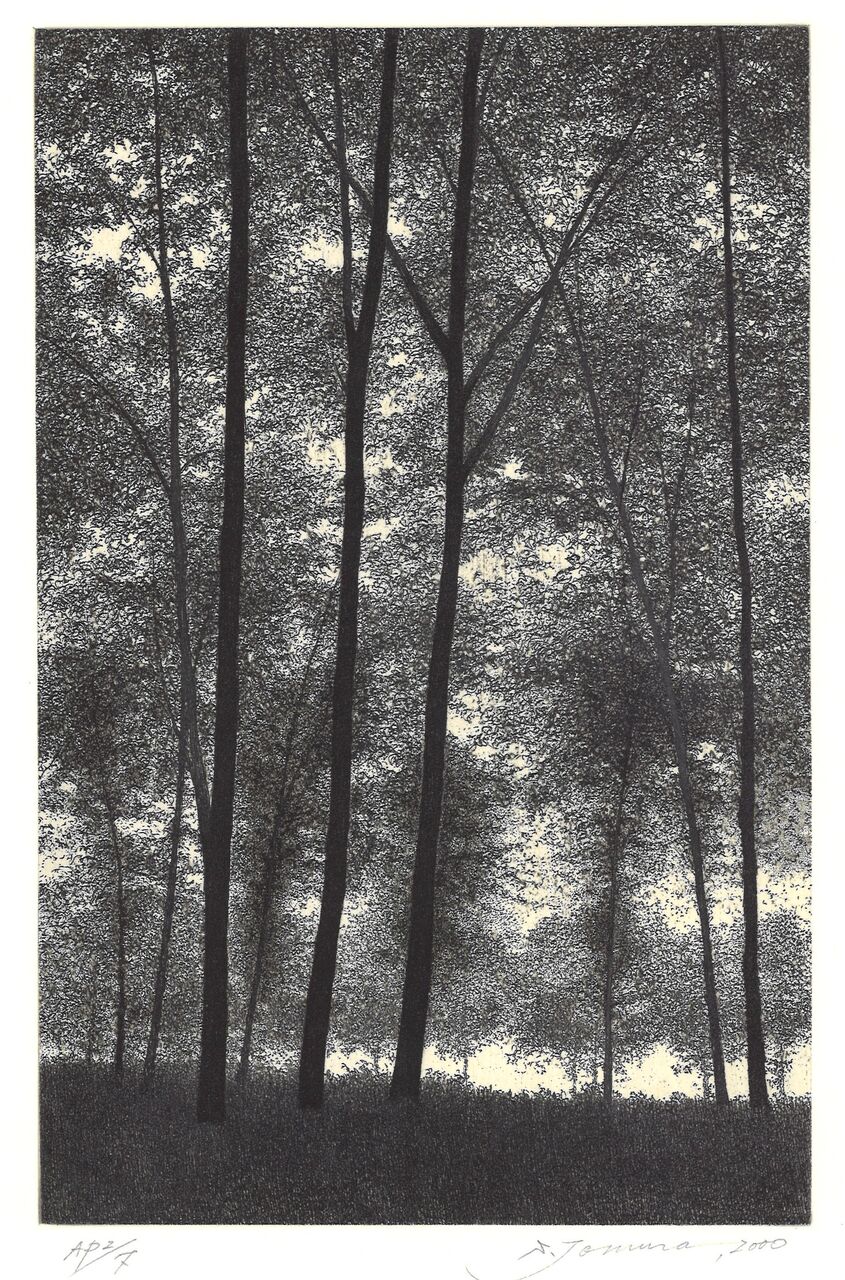 学校では版画の授業がありませんでしたが、私は夏休みのある日、一冊の技法書を頼りに して薄い金属板にドライポイントの方法で線を刻み、壊れかけていた版画プレス機で刷ってみました。期待をふくらませながら取りあげた紙の上にはかすれた線がわずかにあるばかりで、画廊で目にする作品の力強さとは比べものにならないものでしたが、それでも私の銅版画制作は、この一枚から始まりました。