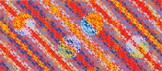 戦前の日本の抽象絵画の先駆者のひとりオノサト・トシノブは、1950年代後半の「ベタ丸の時代」を経て、1960年から円を分割する「円の分割時代」に移った。筆者がかつて勤めていた愛知県美術館にはベタ丸時代の代表作《三つの黒》(1958、油彩/画布、162.2×132.0)が収蔵されている。この時期の作品の背景の大部分は糸状の細い線で埋め尽くされおり、幾何学的な抽象ながら手業感が残っているものであった。円の分割時代以降には、画面全体が色面の区画で構成されるようになった。その絵画世界がシルクスクリーン版画と相性がよいものであることがわかって後の1966年からは、多数の版画が絵画と平行して制作されることとなった。