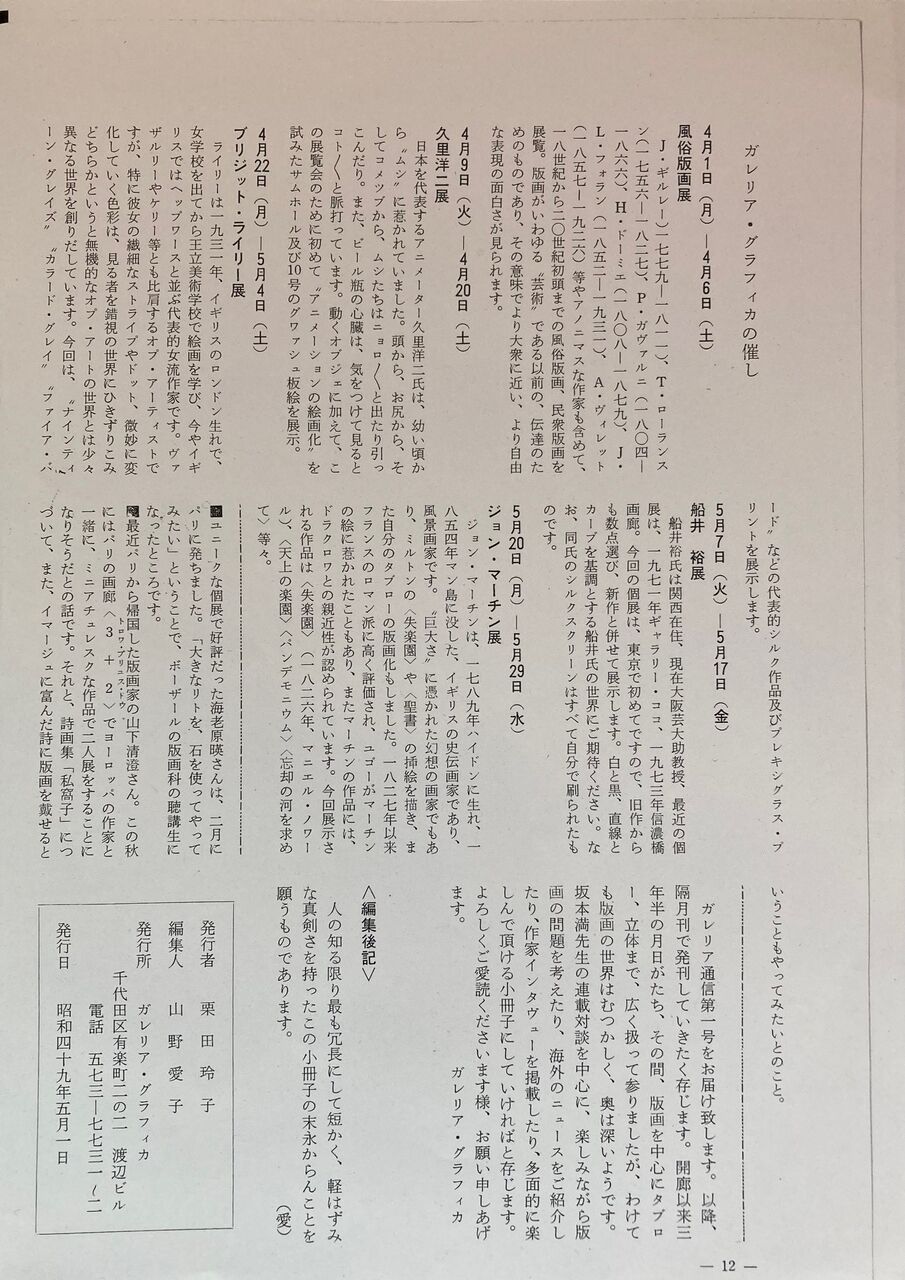 栗田さんは、1964年東京教育大学(現・筑波大学)文学部を卒業後、5年間の出版社勤務を経て、1970年、千代田区有楽町2丁目2番地渡辺ビル内で開廊。地下の13坪、壁面18メートルの空間だった。地上の向かいには、現在西武や阪急のデパートがあり(昔は朝日新聞社や日劇と言った)、地下に降りる階段はちょっと暗かった。中に入ると、栗田さんが「穴倉」というように暗さが続き、天井高を得るために排水管などが剥き出しになっていて、奥の方が少し狭くなっていた記憶がある。当初はパートナーが運営していた通信教育の学生たちの発表の場でもあり、後に画廊のロゴマークをデザインした山岸義明、東大駒場祭のポスターで有名だった橋本治らも出入りしていたことがある。しかし、10万円の家賃も大変になり、パートナーは海外に出向き版画の仕入れに、東京の現場は栗田さんが仕切ることになり、フジタ、ピーター・ブレイク、エルンスト・フックス、ポール・デルヴォー、ジョン・マーティン、ブリジット・ライリーら、ヨーロッパの近現代の版画を中心に営業を続けていく。展示作品は額装されていたが、古い版画は元となるのは稀覯書であり、ページをバラして販売していたら、お客さんに古書店かと言われもしたそうな。ユニークなところでは、72年に今和次郎の民家のスケッチ展があった。しばらくして最大30ページの『ガレリア通信』なる媒体を発行、筆が遅い阪本満氏への対談形式での古版画の蘊蓄や版画家へのインタビュー、海外ニュースを掲載していた。