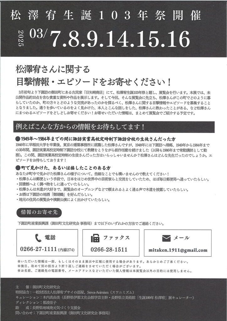 3月、長野の地でたっぷりと松澤氏の世界を堪能してみてはいかがでしょうか。