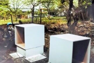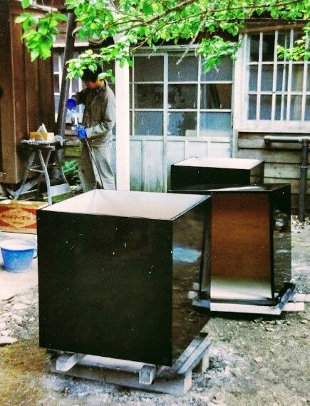 じつは当初は90cm角のキューブ12個を連ねる予定で制作していたのだが、高木がアトリエに来て見て、あまりの嵩に70cm角×10個に縮小案が出された。たしかに2個積み上げるとピッタリ140cm高になるではないか。これ幸いに従うことにした。スケールと量の決断とは、ルナミ画廊における榎倉康二からの引き算の指摘でもそうであったように、空間把握においていつも迷わされる悩みの種であった。まあ、これで塗装作業もいくぶん楽になった。