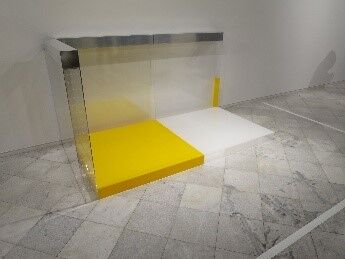 70cm直角キューブ×10の門型床設置、70×140×420cm 、表面はurethan鏡面塗装ウレタン吹き付け、水研ぎ研磨交互重層によった。