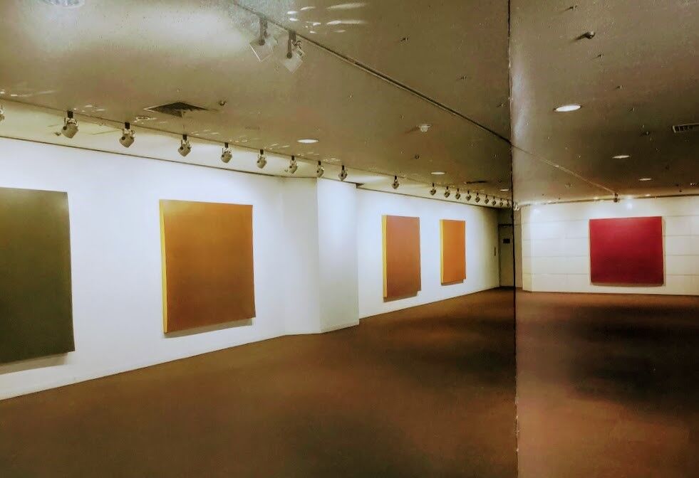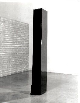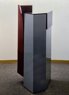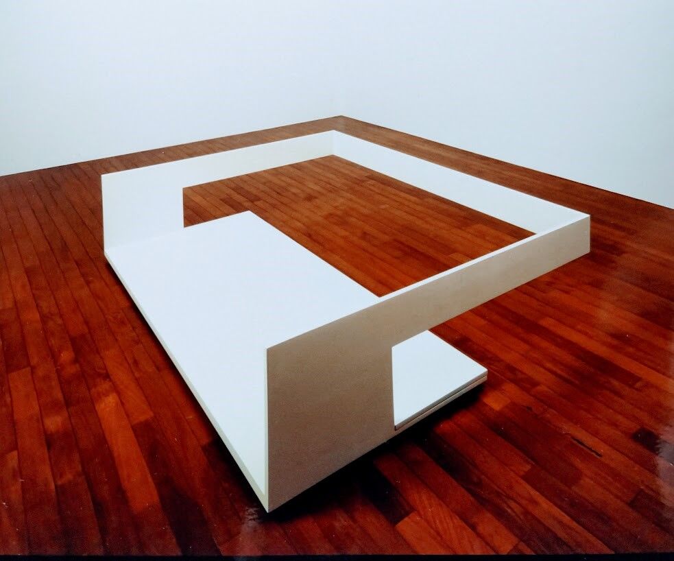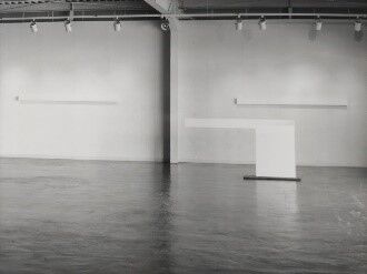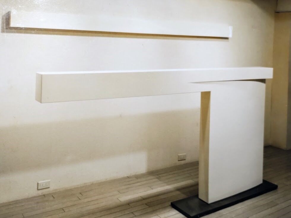 赤坂の宮脇愛子さん宅で丸山きよ子さんとお茶していたときに、「行きつけの美容師の仲村くんが銀座に画廊を開いたのだけれど、展覧会をしてもらえないかな」ということで、その年は信頼する岡田昌宏さんを紹介して翌年開催することにした。リシツキーの《雲の鐙》よろしく、上辺がぐっと水平に飛び出て空間に突き出すシリーズだった。壁にはこれと呼応すべく、同寸の細長い白い矩形体が2本設置され、飛翔感を強めた。