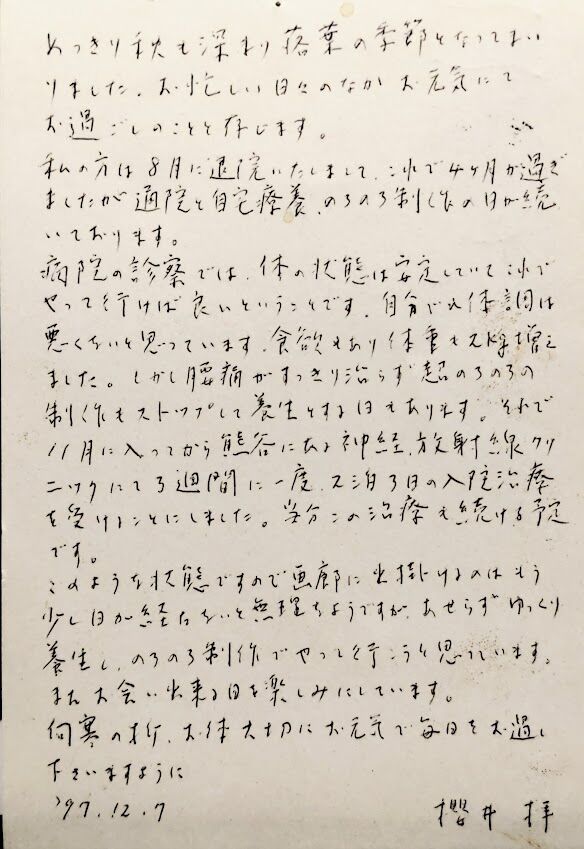 1977年に初めて櫻井英嘉の作品を目にしていたのだが、じつに遅まきながら、この展覧会を契機に、櫻井美智子の引き合わせで作家本人と知遇を得たのだ。作品を一渡り見ていただいた後に、「塗るとは、こういうことなのだよ!」という尊敬してやまない塗りの大家からのお褒めの言葉をいただいた。以後、妻ともども、たいへん親しくさせていただいた。このころから氏は病と闘われてもいたが、定期的に体調を記したお葉書をいただいていた。万年筆で几帳面に横書きされた文字列を見ていると、あの横ストライプ作品を彷彿させた。