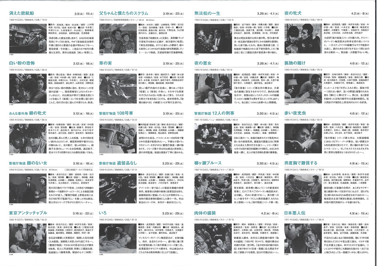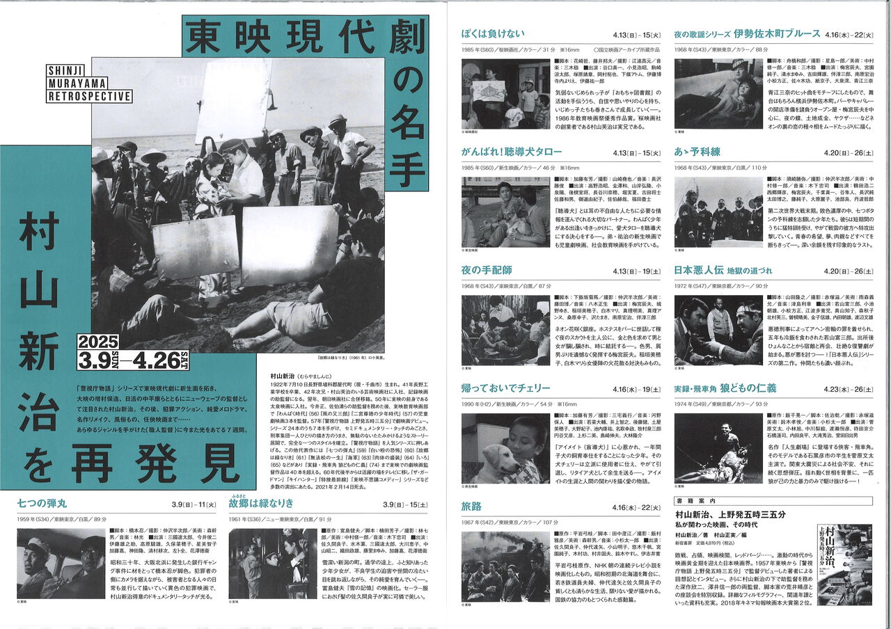 <「警視庁物語」シリーズで東映現代劇に新生面を拓き、大映の増村保造、日活の中平康らとともにニューウェーブの監督として注目された村山新治。その後、犯罪アクション、純愛メロドラマ、名作リメイク、風俗もの、任俠映画……あらゆるジャンルを手がけた〈職人監督〉に今また光をあてる7週間。>(劇場ウェブサイトより)