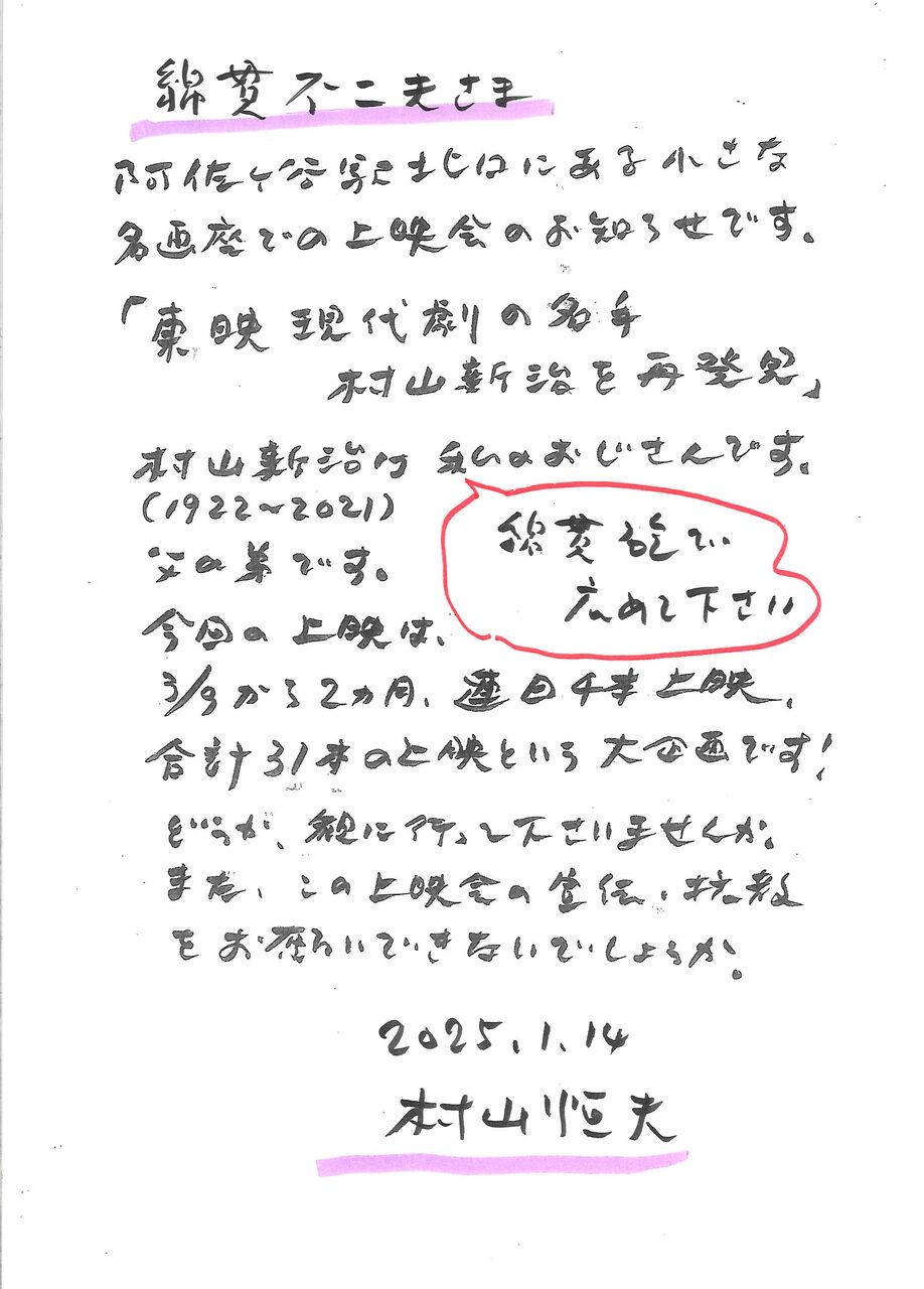 旧知の編集者・今はない新宿書房の村山恒夫さんから手紙をもらった。