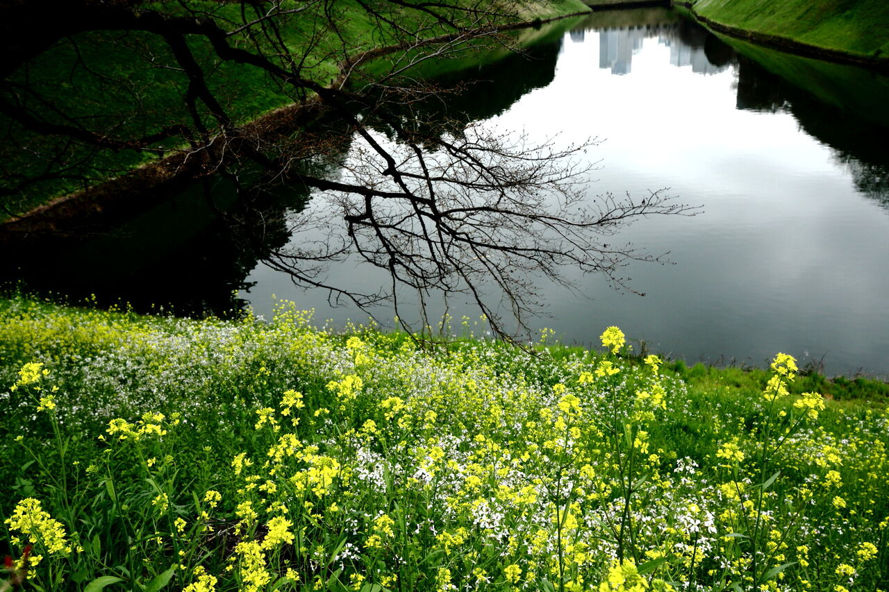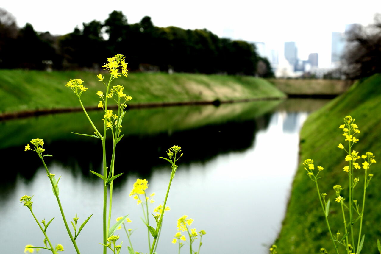 ph4 半蔵門濠。代官町通りの土手。菜の花が咲く。奥は永田町。2024.3.28
