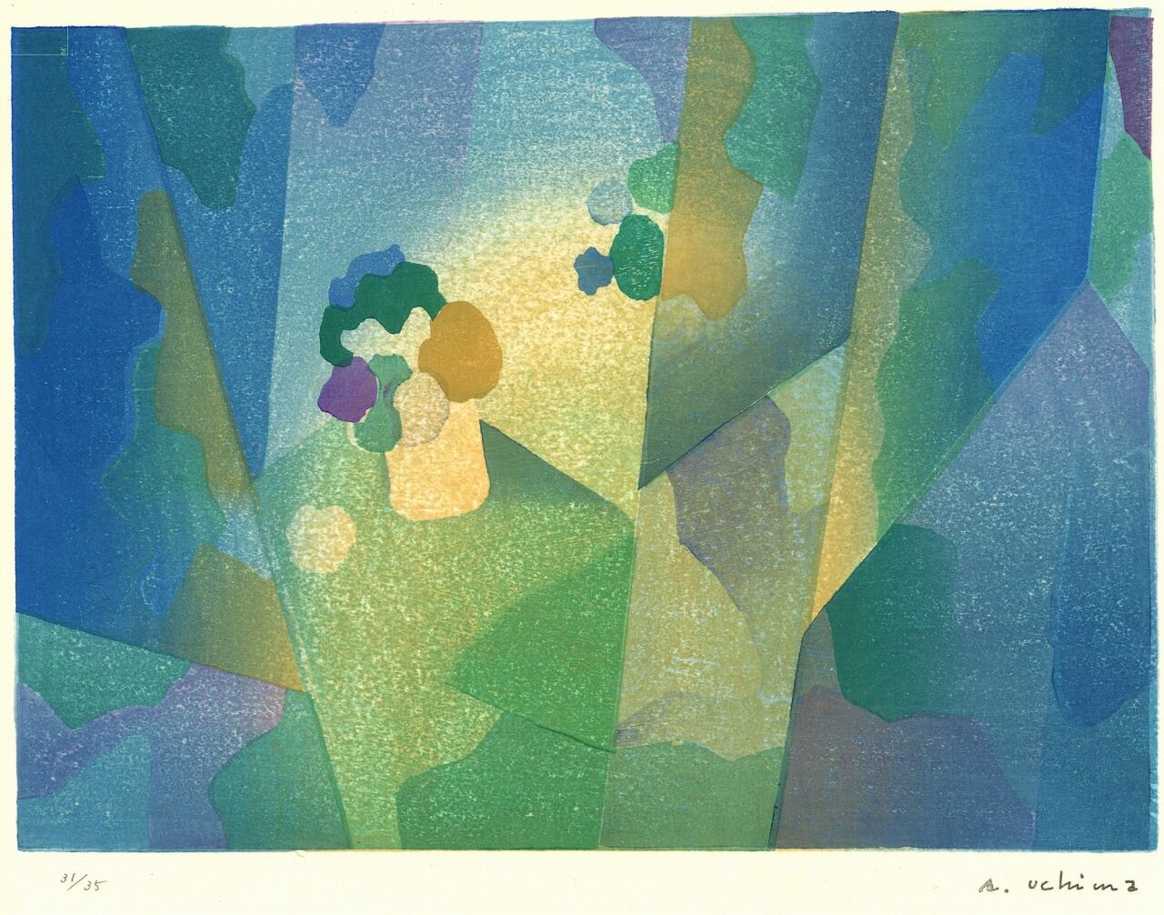右)内間安瑆《Space Poem B》1974年 木版画 37.5×39.0cm