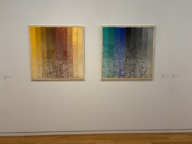 左)百瀬寿《Ten Stripe: Yellow Copper to Gold》1989年 アクリル絵具、和紙、キャンバス 88.5×88.5cm