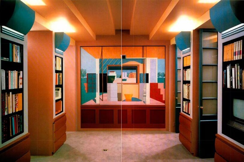 実は、この木版画のもととなったドローイングは、マイケル・グレイヴスが手掛けたインテリアの一部としても使用されている。それは、作品集では「アパートメント・リノヴェーション」というタイトルで紹介されている、1979年のニューヨークの改修プロジェクトである。*3 今となっては、先にドローイングがありそれを建物に組み込んだのか、それとも設計を進める中で、その場所のためにドローイングを描いたのかは不明である。しかし、いずれにせよ、グレイヴスの構想した空間に組み込まれることで、幻視的効果がより発揮されている。