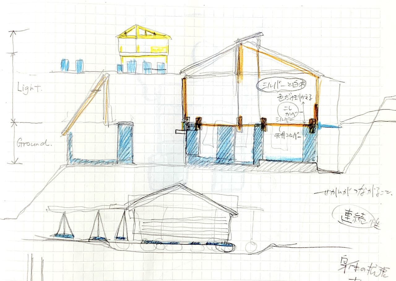 (万博での塗装作業に関するスケッチ。上のスケッチは同時に検討していた二宮町のプロジェクトについて。ちなみに二宮町のこのプロジェクトも「仮屋」というタイトルをつけている。)