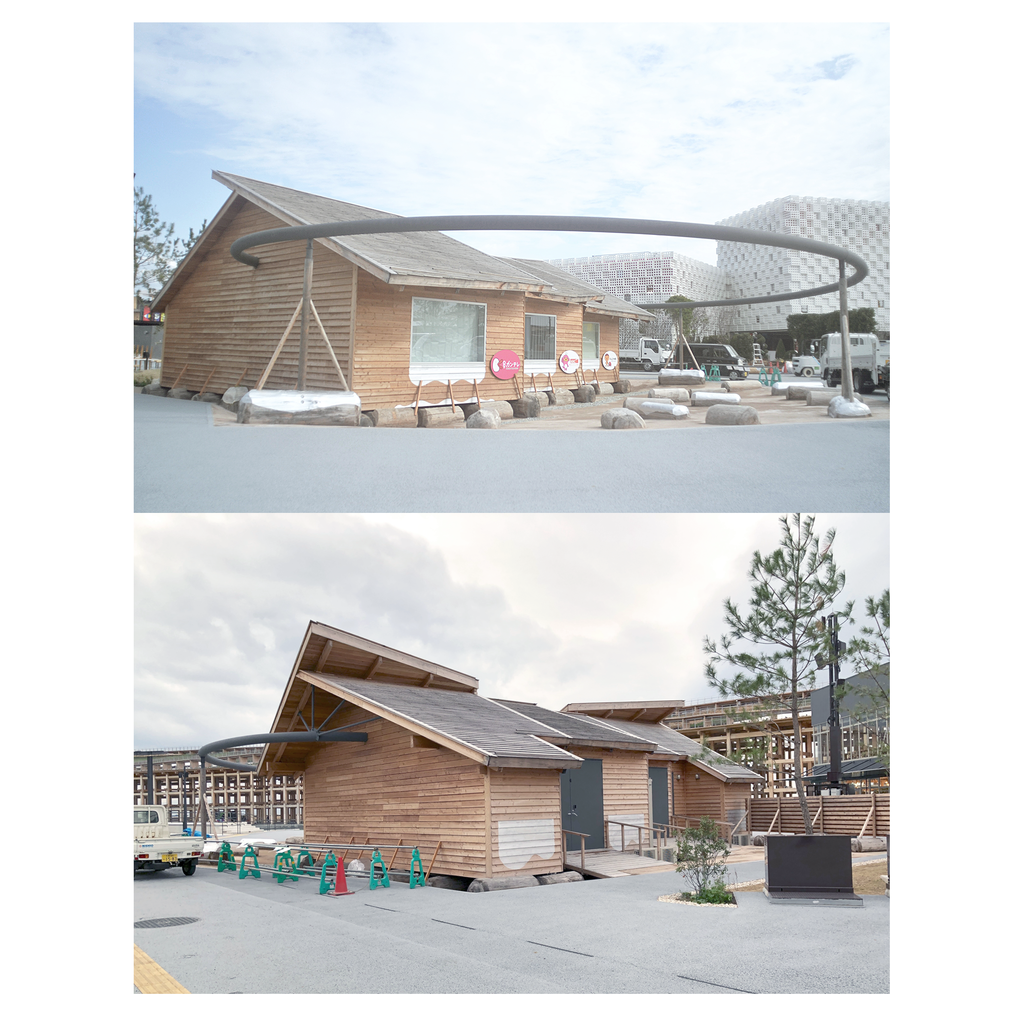 9-今回の現場では最後の最後にいくつかの装飾的モチーフを建築表面に加えた。近代建築からすれば不純であり、タブーでもある。けれども不可避に付いてくる企業看板や会場全体の装飾を考えれば、必要だったと思っている。建築工事後の表面の付加・改変を可能にするために外装材に木板貼りを選んだ意図もあった。(そんな介入はまた、建築を考える設計者である自分自身のリアリティ獲得としても必要だった)さらに、今回の万博会場に立つ様々な建築の殆どが、表面的な装飾や半屋外的な装置の付加によって成り立っていることも事実だ。つまり内外それぞれの在り方に連関がなく、内部は限りなくブラックボックス化されているか、あるいはそもそも内部が無い。祝祭の場におけるそうした建築の在り方の可能性?と限界については、議論の対象として考えるべきではないか。