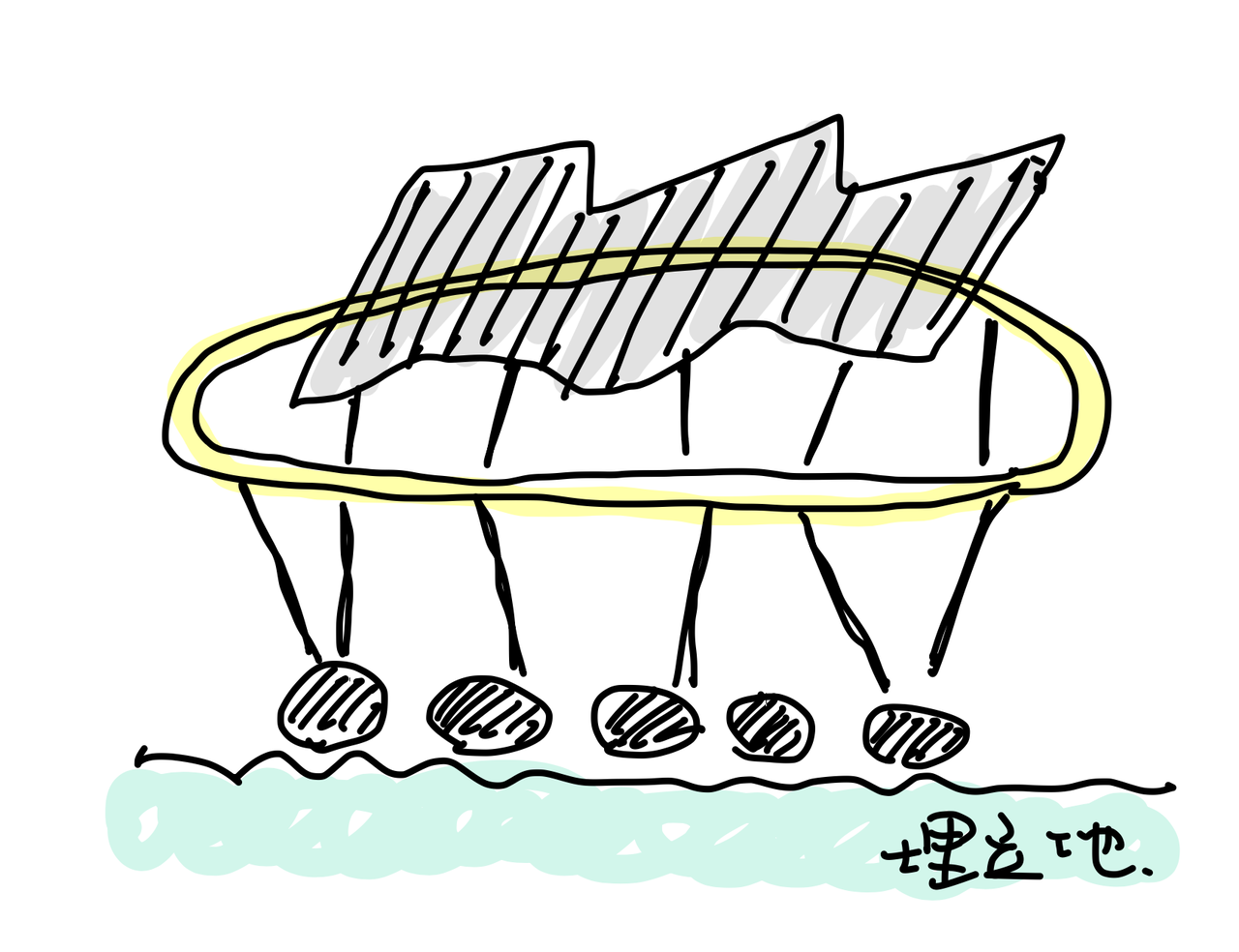 6-木製丸太基礎は、フクシマへの移築先においては、常設の建築基礎の型枠として使い回す。おそらく4-のプロセス論の内実と深く関わる。