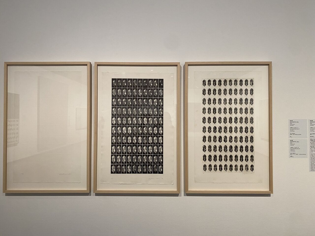 松本旻のくろまめの版画は、一つ一つ違うくろまめの版を100個つくり、いっぺんに刷るという骨の折れる作品。くろまめのサイズや形はほぼ同じですが、同じ版を使わないなんて・・・並大抵ではないですね。