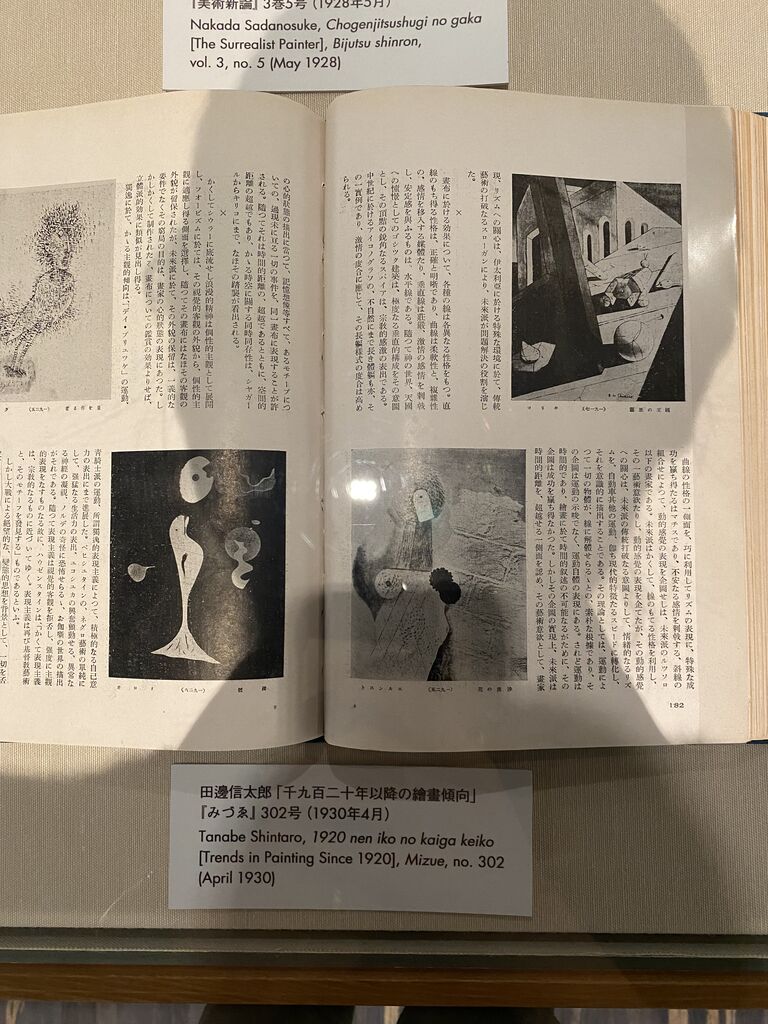 展示台には、《砂漠の花》の画像が掲載された『みづゑ』302号(1930年4月)田邊信太郎「千九百二十年以降の絵画傾向」や、瀧口修造が翻訳した『超現実主義と絵画』の資料展示もあり。同書にも《砂漠の花》が掲載されているそうで、そのほかの媒体にもシュルレアリスム絵画の作例として登場しているという《砂漠の花》が、いかに重要な作品であるかを指し示しています。