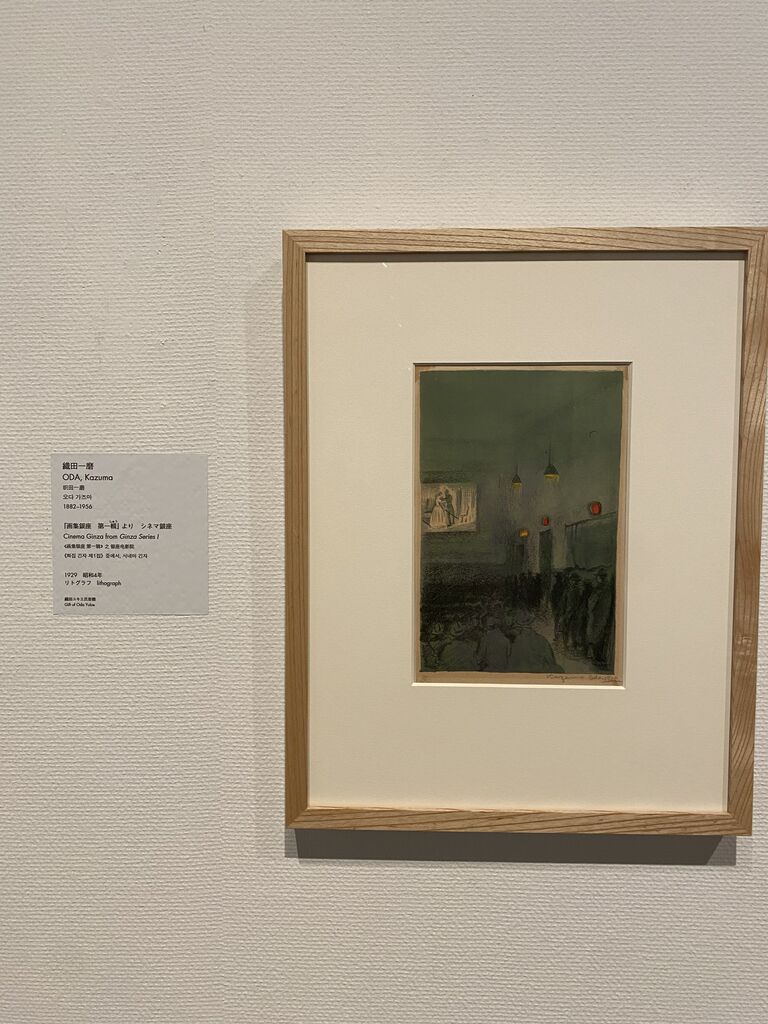 新収蔵作品のお披露目もあり、寄贈を受けた織田一磨の水彩画など多数展示されていました。その中でも織田ユキエ氏寄贈の『画集銀座 第一輯』の《シネマ銀座》は、黄色と赤の明かりのみ照らされた薄暗い映画館に集まった昭和初期の人々の様子が小品ながらによく描かれており、見入りました。