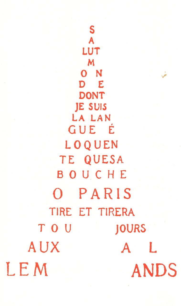 Salut monde dont je suis la langue eloquente que sa bouche o Paris tire et tirera toujours aux allemands(やあ 世界 私はその雄弁な舌だ その口は おお パリよ 舌を出し 今後も出し続けるのだ ドイツ人どもに対して)