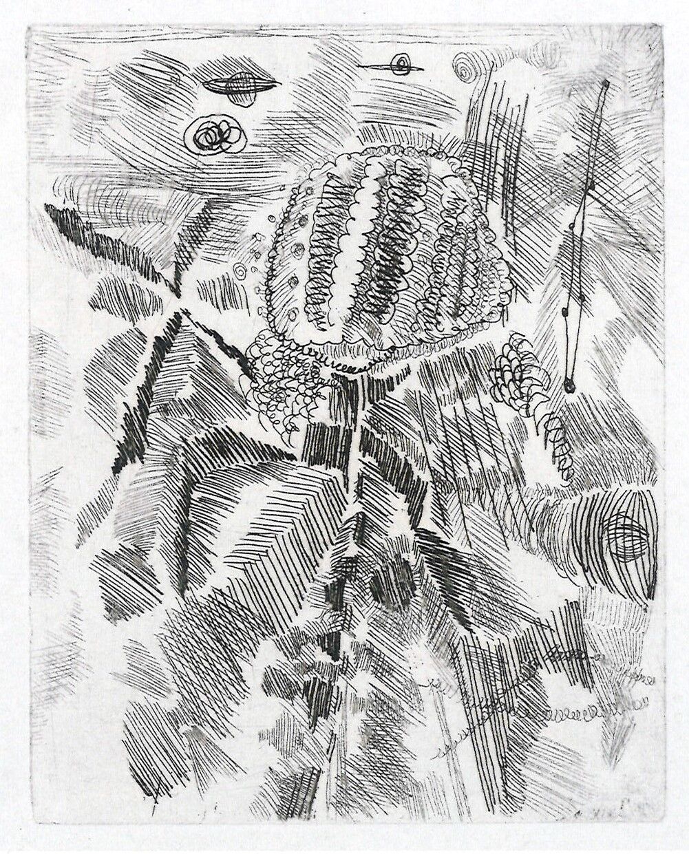 何より、《貝》では、貝と思しきモチーフは、重力から解放され、空中に浮遊するかのように描かれており、点描による抽象へと展開する時期の油彩画と共鳴している。そのような点もふまえて、最後に、もう1点、1958年制作のエッチングを紹介しておきたい。この版画作品を、今回取り上げたフォト・デッサン(fig.1)と、そして、今回紹介した参照作品と、描画が施された透明シートと、相互参照することで、フォト・デッサンにおける描画の重要性という論点が、さらに深められるはずである。